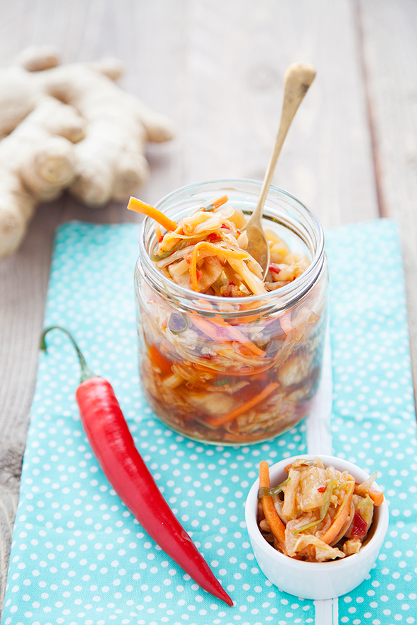 Laisser le kimchi fermenter pendant 3-4 jours minimum et 1 semaine maximum. Goûter, les légumes doivent être tendres, et acidulés. Si une odeur étrange (de moisissure par exemple) se développe jeter le kimchi. L’odeur du kimchi est forte mais pas nauséabonde, on sent bien le chou, l’ail et le gingembre. Placer le bocal de kimchi au frais en veillant à fermer bien hermétiquement le couvercle pour éviter les odeurs.
