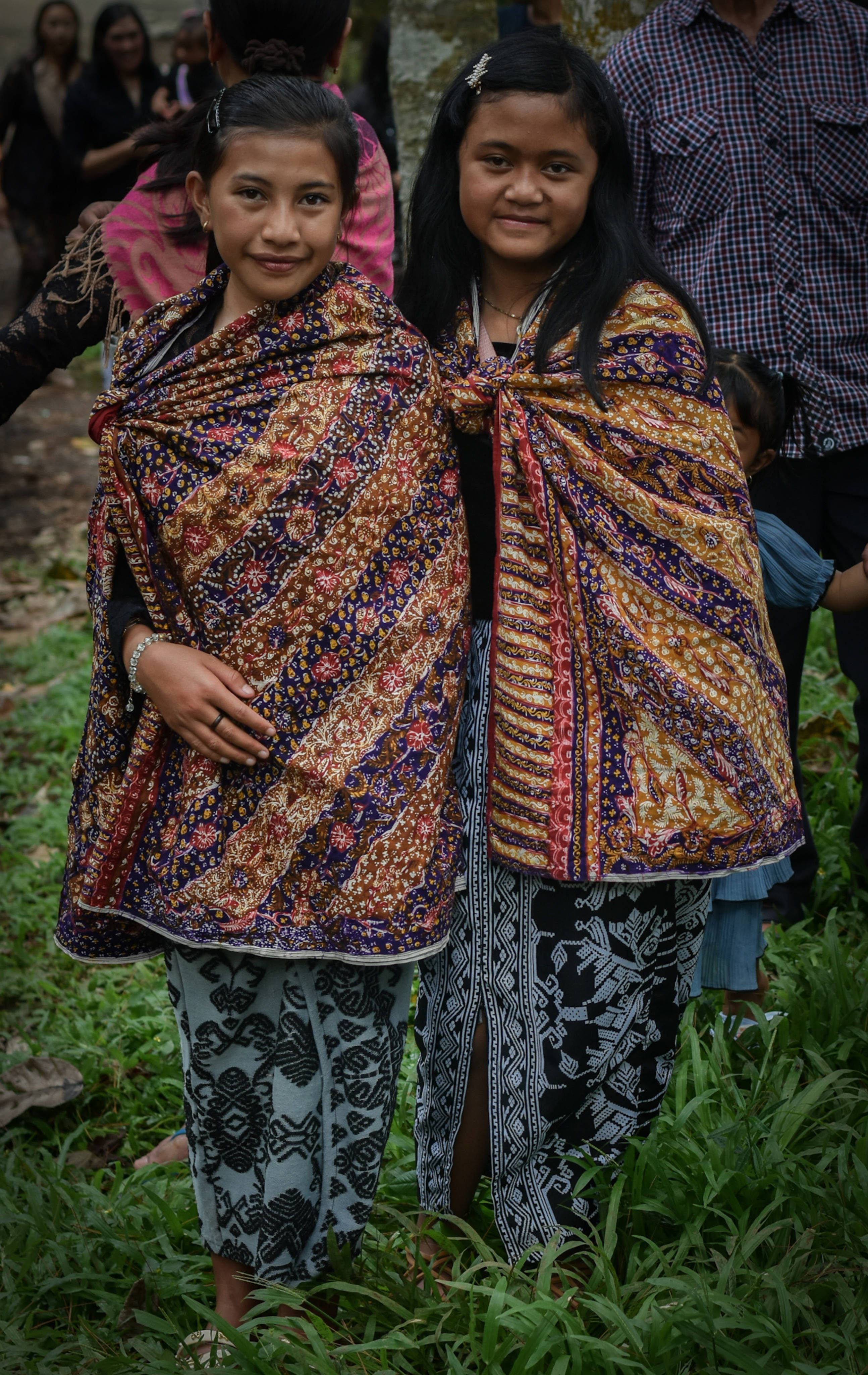 Jeunes filles vêtues de costumes traditionnels javanais (motifs batik) lors de la célébration du Vesak Day au temple Sumberawan, à Malang, dans la province de Java oriental, en Indonésie (12 mai 2025) © image Aman Rochman